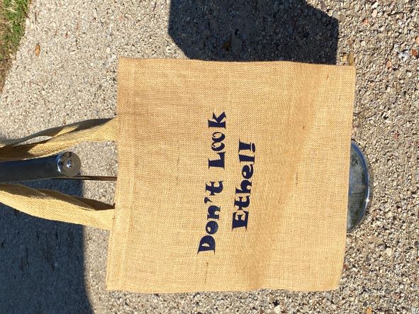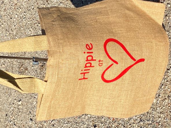 A Tote bag With Groovy sayings on them made from Jute 15" x 16" Dimensions