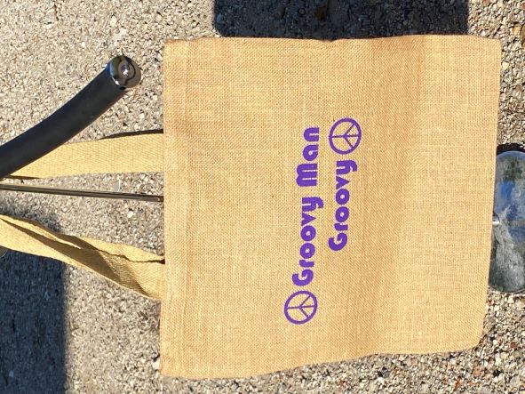 A Tote bag With Groovy sayings on them made from Jute 15" x 16" Dimensions