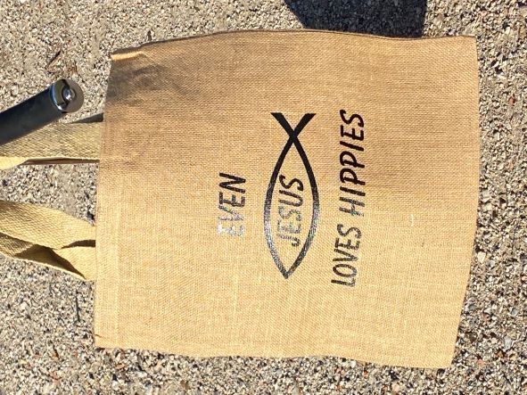 A Tote bag With Groovy sayings on them made from Jute 15" x 16" Dimensions